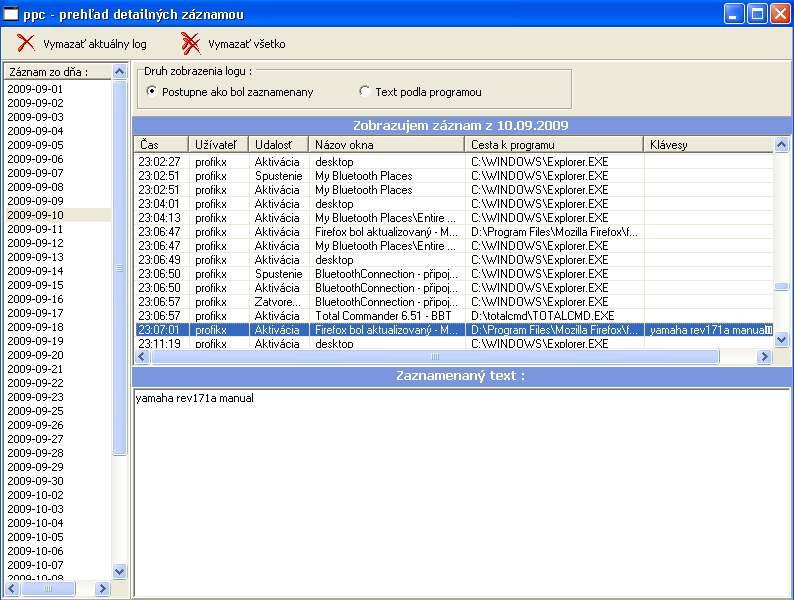 Pri výpise zaznamenaných údajov sa zobrazuje dátum, čas, meno užívateľa, udalosť, názov okna programu, miesto uloženia a názov programu, text napísaný v tomto programe. Výpis je možné zoradiť podľa času ako bol zaznamenaný alebo ako všetok text napísaný v jednotlivých programoch za celý deň. Zaznamenaný text je možné skopírovať pre dalšie použitie.