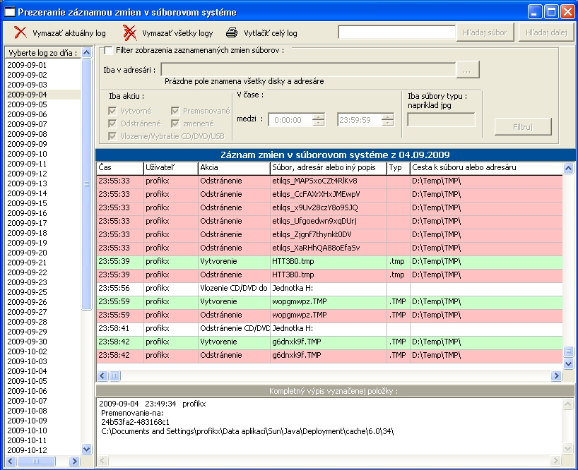 Pri výpise zaznamenaných údajov sa zobrazuje dátum, čas, meno užívateľa, akcia, názov súboru, typ(prípona súboru) a cesta k súboru (miesto uloženia na disku. Veľa súborov vytvára a maže rôzny software nainštalovaný v PC a preto výpis je možné filtrovať podľa akcie, času prípony súboru alebo miesta jeho uloženia alebo vyhľadávať v názvoch súborov. Tieto filtre je možno vzájomne kombinovať.